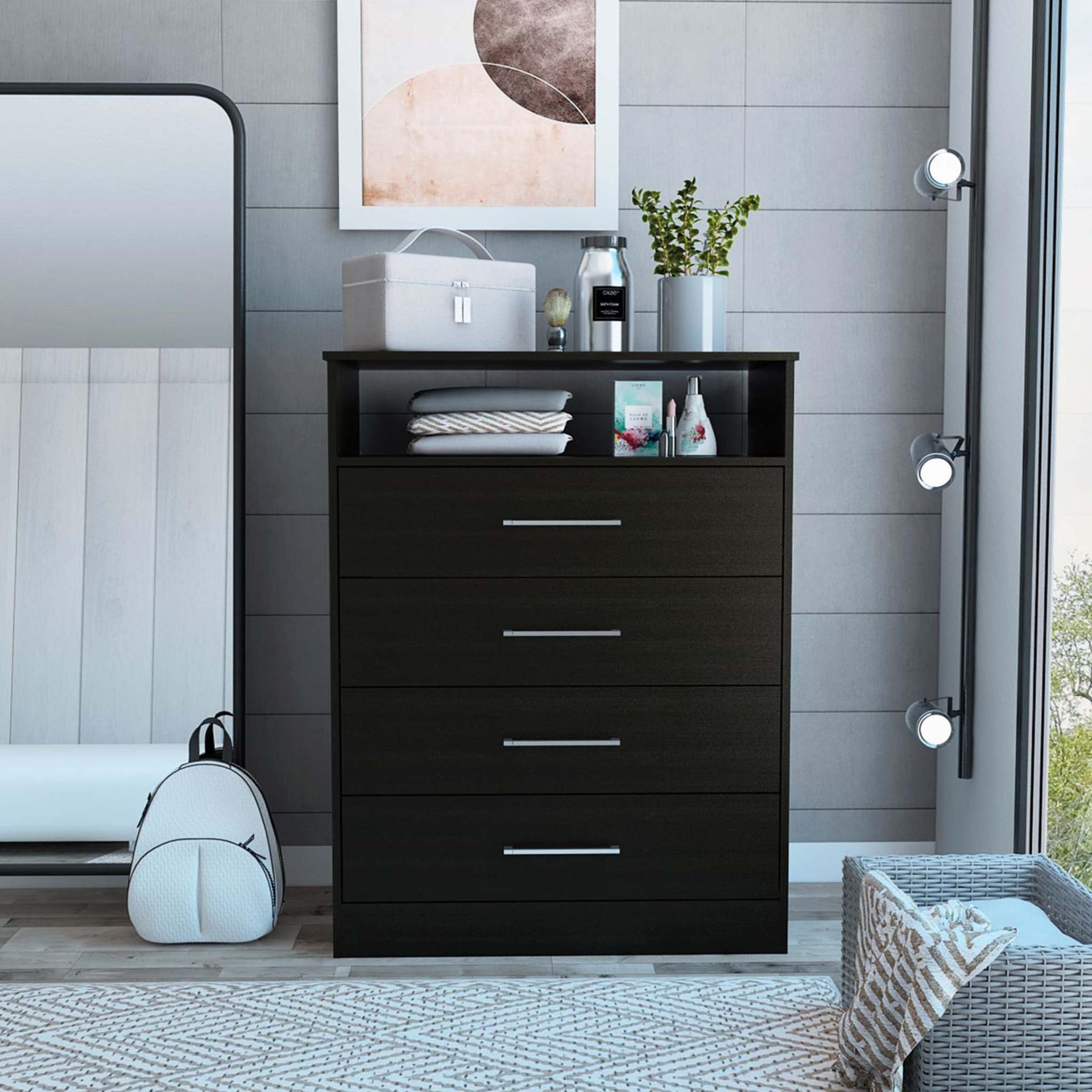 Kairo Dresser offers a modern timeless look with a beautiful finish and plenty of different storage options available. The top base also works as a TV stand (up to 47″ Flat screen with their proper base). Featuring 4 drawers (7.5H x 29.6 Wx 14.2 D) this dresser will cover any storage needs you may have. One additional feature is the top open shelf, is always good when you can have handy your most frequently used items like books, headphones or your cellphone. Standing at 43″ High and with all metal hardware and handles this is a great addition to your bedroom. Designed with elegant black wengue and white manufactured wood finish.