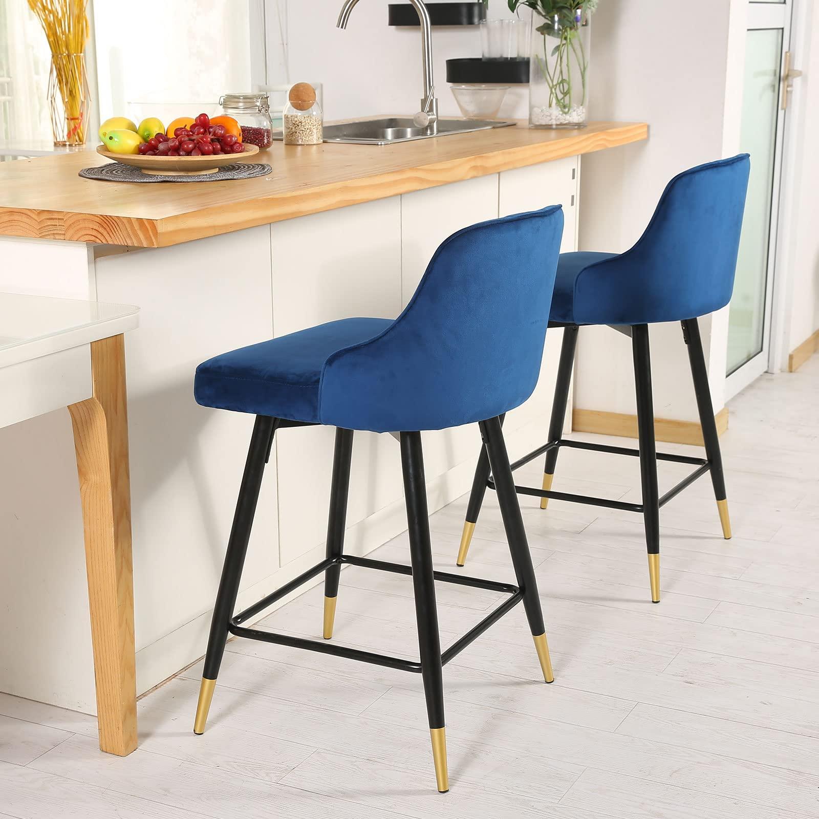 Comfort and design come together nicely in this set of two 36″ blue velvet and black and gold iron swivel bar height chairs. The black and gold coloration of the high quality iron base marries nicely with the blue velvet seat. Not only good looking and stylish, this chair features a square shaped seat and a full back for the ultimate in comfort and enjoyment. This stool will look great in your dining room, kitchen, bar, or recreation room. 35.5″ H x 18.9″ W x 17.7″ D