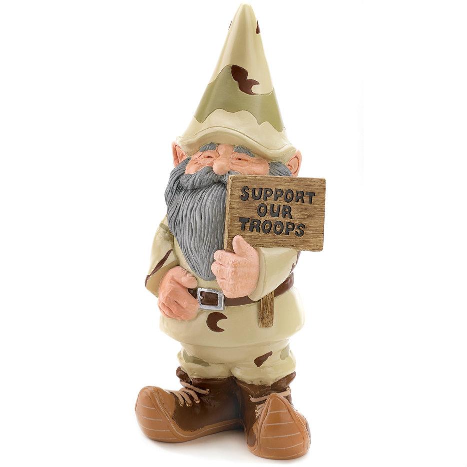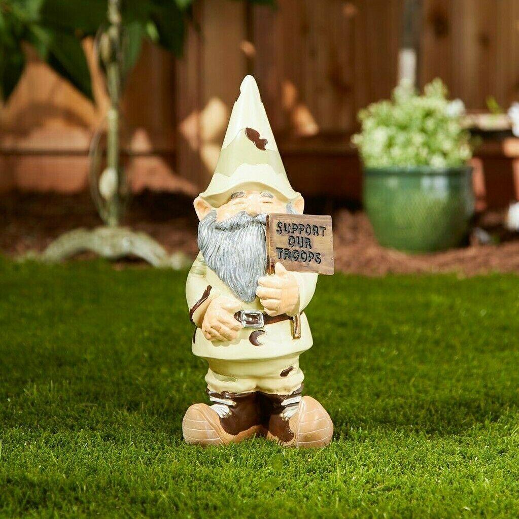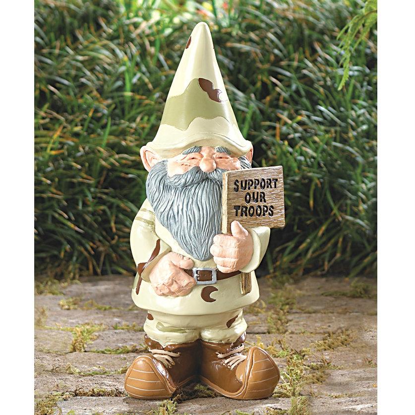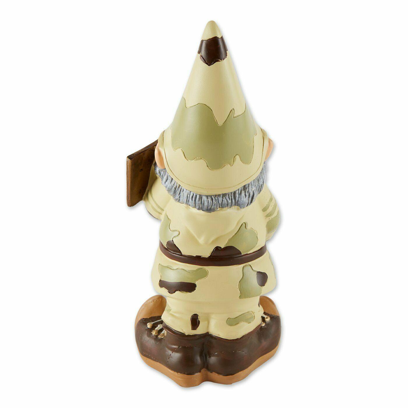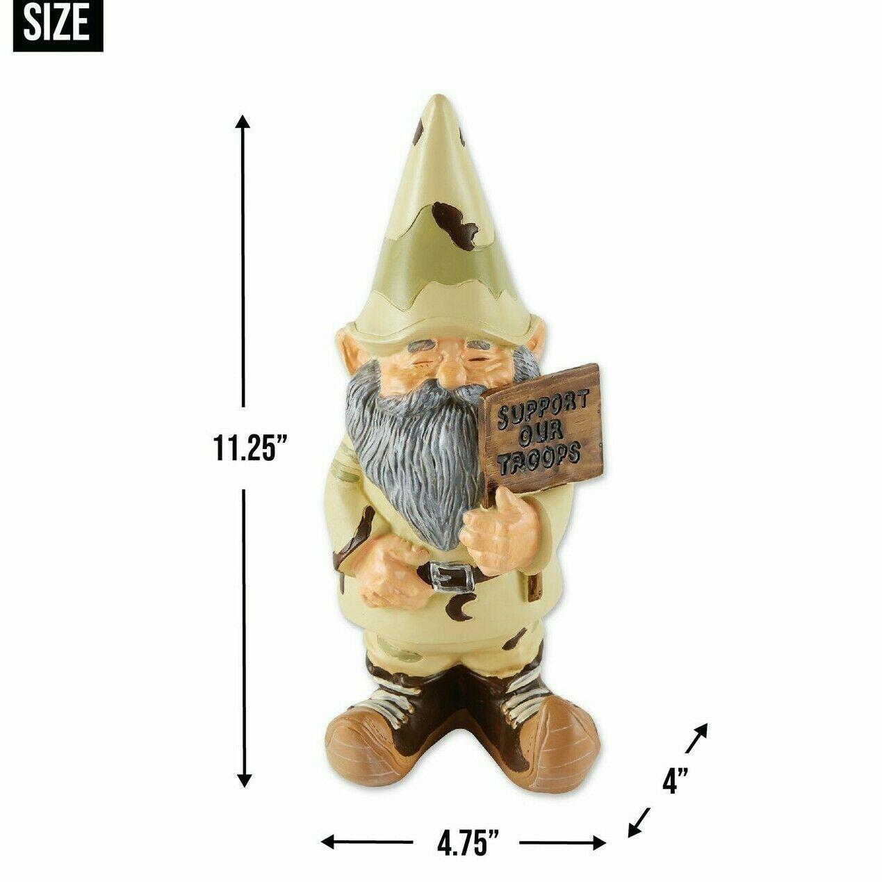 Muestre su apoyo a las fuerzas armadas de la nacin exhibiendo con orgullo este gnomo de jardn vestido de camuflaje! Peso 1.2 libras. Poliresina. 4.75 x 4 x 11.2 pulgadas.